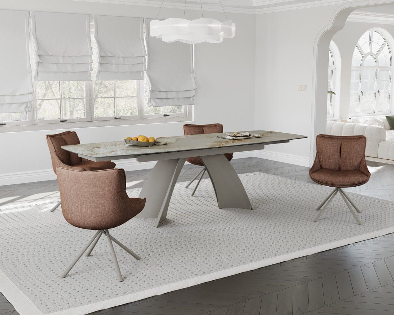 Raztegljiva jedilna miza TOKYO (rjavi marmor) je popolna izbira za vaš dom, saj združuje eleganco in funkcionalnost. Prilagodite dolžino mize vašim potrebam in uživajte v izjemni kakovosti materialov ter modernem videzu, ki bo navdušil vaše goste Celoten opis