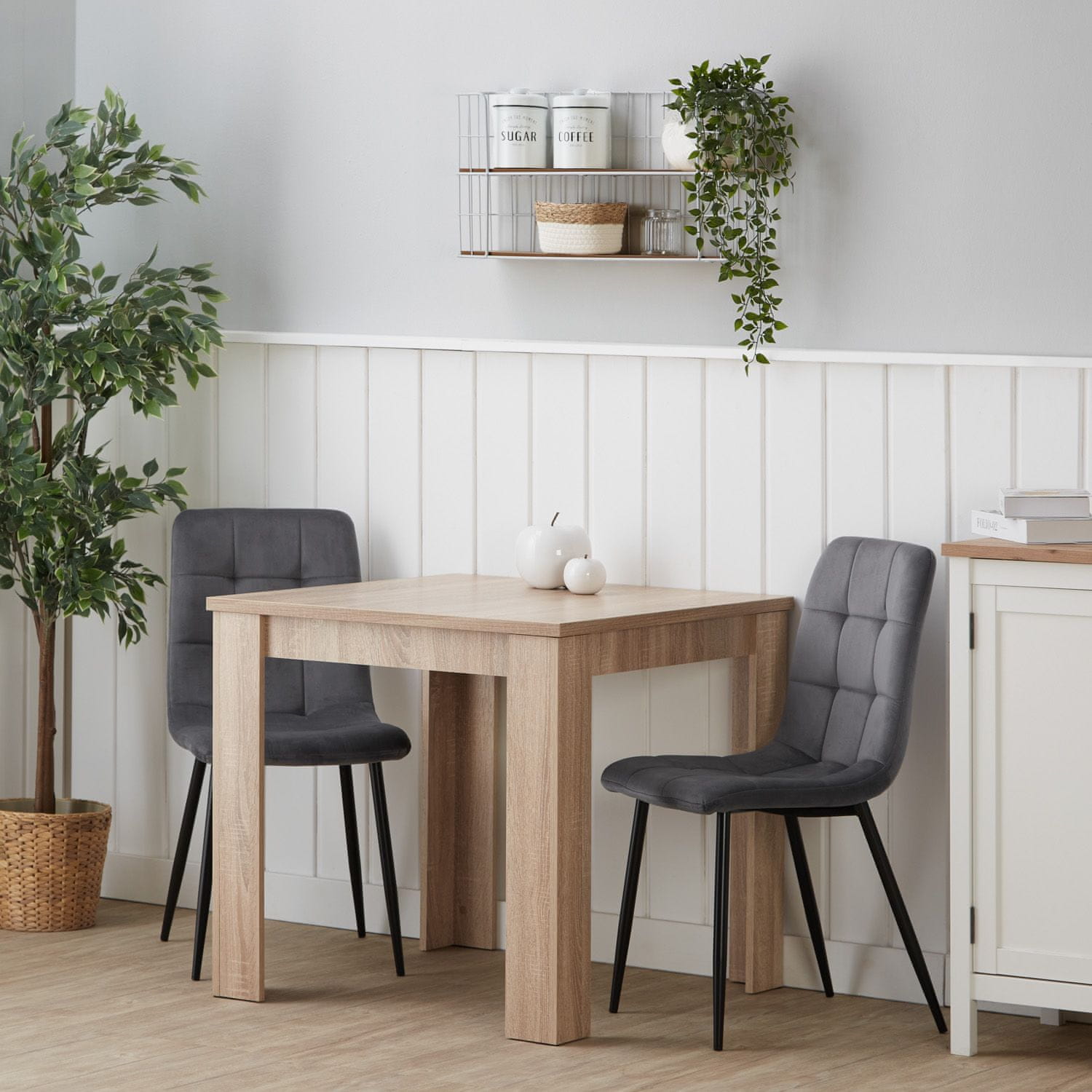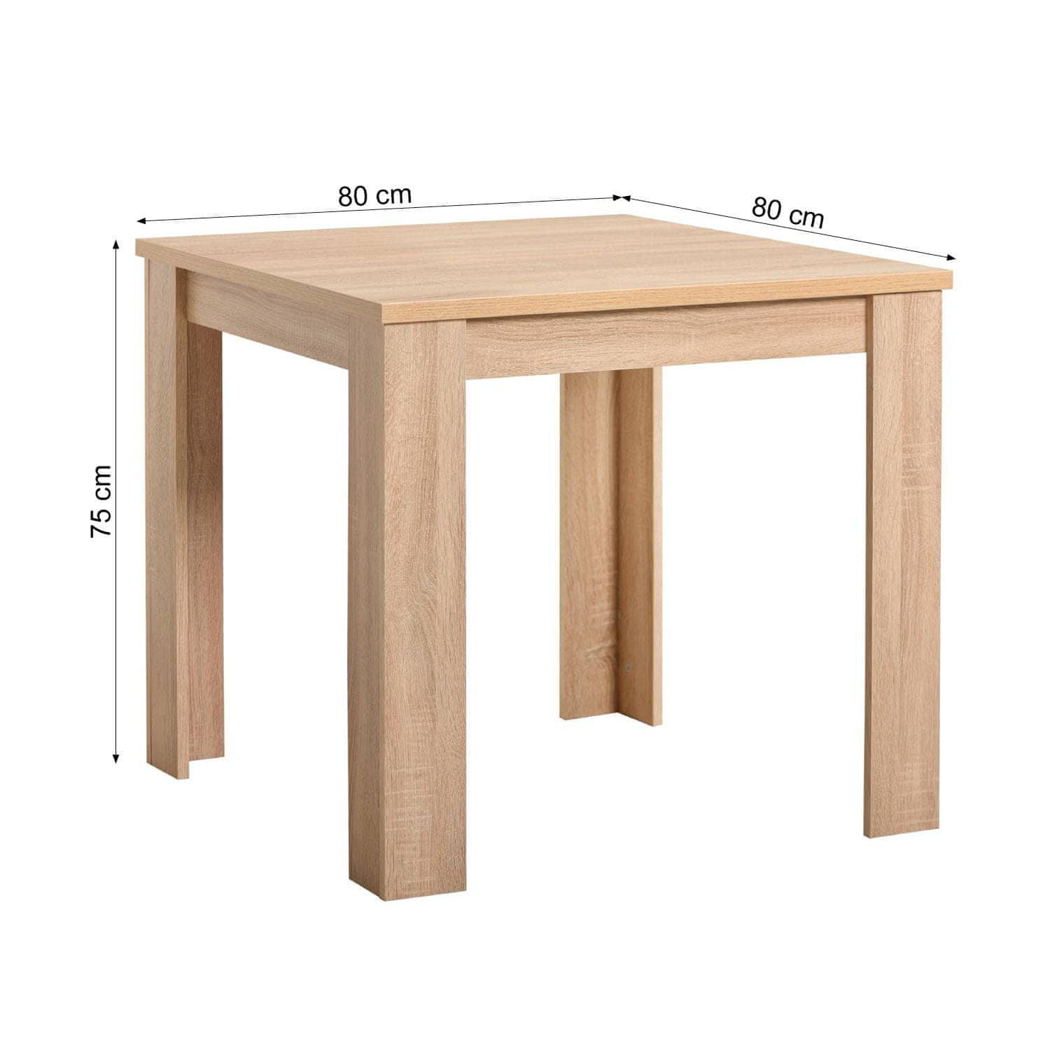 Ta sodobna jedilna miza je zasnovana kot praktična in elegantna rešitev za majhne prostore. Njena kompaktna velikost je idealna za samske, pare ali manjše družine, saj se brez težav prilega kuhinjam, jedilnicam ali dnevnim prostorom. Miza ima videz naravnega hrasta, enostavno za čiščenje površino in trdno konstrukcijo, zaradi česar je funkcionalna in vizualno privlačna za vsakodnevne obroke in druženja.