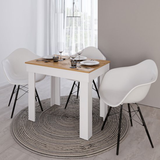 Potopite se v sodobno bivanje s to prostorsko varčno jedilno mizo, zasnovano tako, da vašemu domu prinese svež in prijeten pridih. Idealna za samske, pare in majhna stanovanja, njena elegantna zasnova in hrastov videz površine jo naredita za stilsko središče vsake jedilnice. Kompaktne dimenzije in enostavna za vzdrževanje omogočajo brezhibno vključitev v vašo kuhinjo, jedilnico ali dnevno sobo ter zagotavljajo prijetno okolje za obroke in druženja.