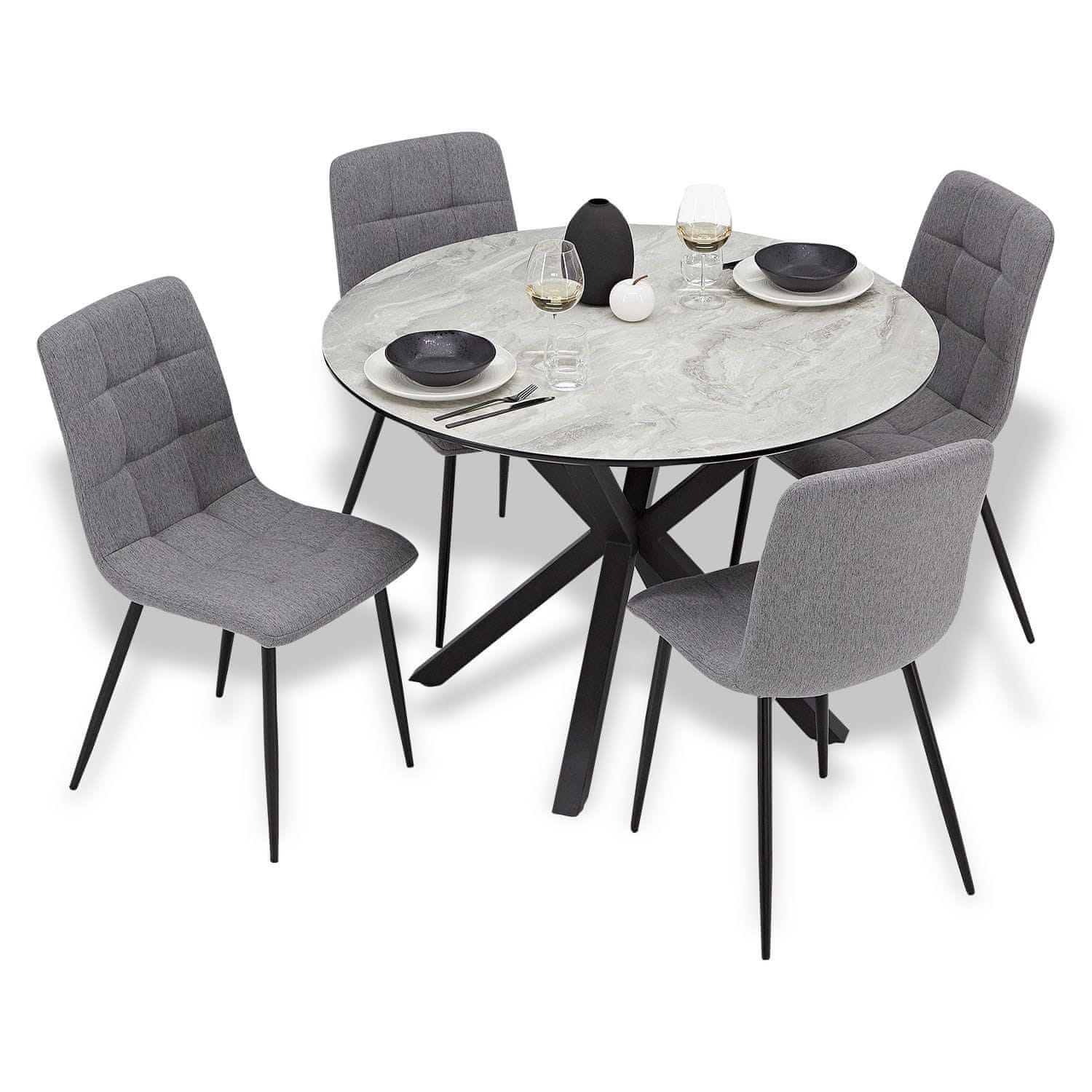 Ta 4-delni jedilniški set je zasnovan za sodoben slog in udobje v manjših prostorih. Vsebuje okroglo jedilno mizo s kamnitim videzom površine in štiri oblazinjene stole kar zagotavlja prijetno okolje za obroke druženja ali vsakodnevno uporabo. Kombinacija trpežnih materialov in enostavno vzdrževanih površin zagotavlja da je ta set praktičen in vizualno privlačen primeren za kuhinje jedilnice ali odprte bivalne prostore.