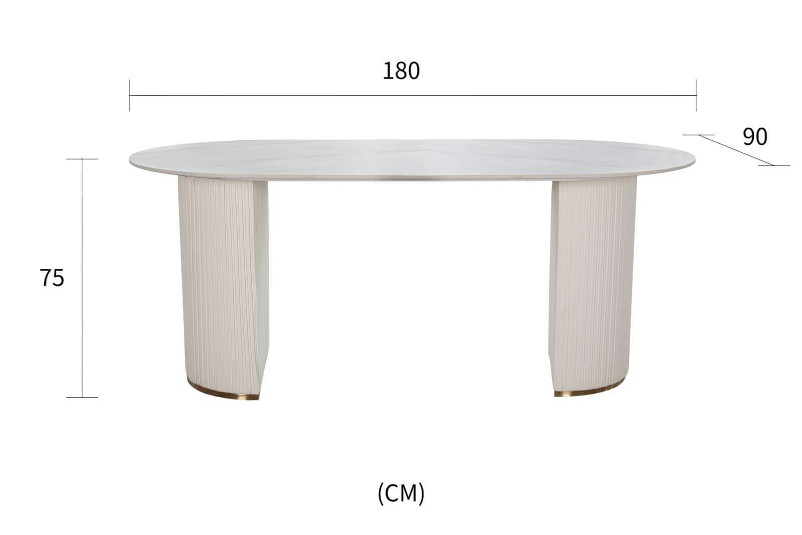 Sodoben jedilniški stol z elegantnim dizajnom idealen za sodobne jedilnice ali dnevne sobe. Masivne polkrožne noge oblečene v ekološko usnje z navpičnimi gubami in zlatimi poudarki mu dajejo edinstven značaj. Ovalna plošča v imitaciji marmorja poudari stil in funkcionalnost pohištva ter ga naredi za popolno izbiro tako za vsakodnevne obroke kot za družabna srečanja.