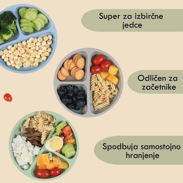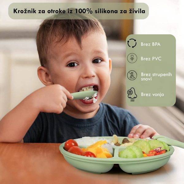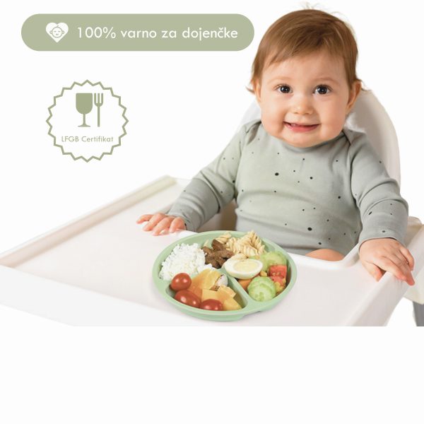 Naši krožniki so narejeni iz 100 % silikona za živila – ni nobenih polnil ali škodljivih materialov, ki bi lahko prišli v stik z hrano vašega otroka! Izjemno vzdržljiv in nezlomljiv silikon je idealen material za posode za malčke – nič več počenih krožnikov ali trošenja denarja za njihovo zamenjavo! Popolni krožnik v obdobju, ko se vaš otrok uči jesti za mizo! Poleg tega je silikon primeren za pomivanje v pomivalnem stroju in uporabo v mikrovalovni pečici.