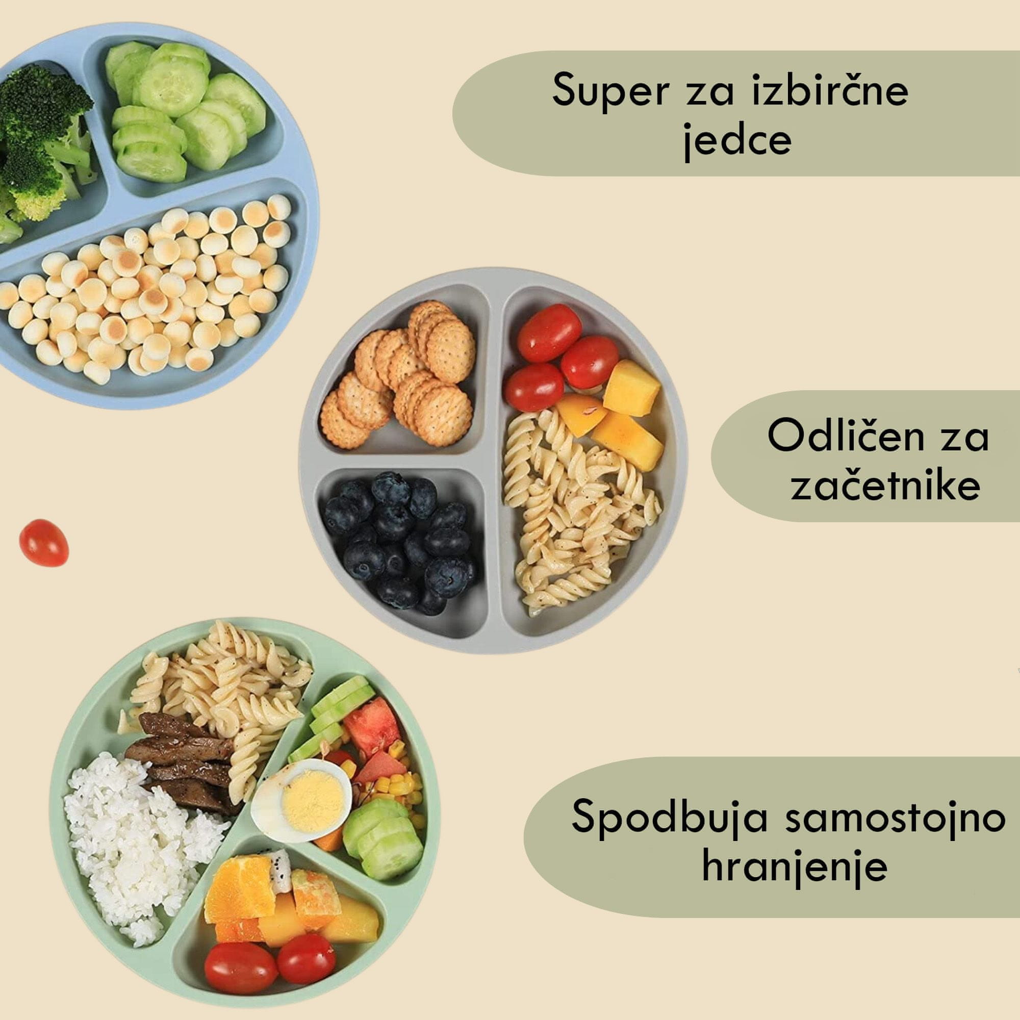 Kidkool otroški krožniki so zasnovani, da pomagajo odraščajočim otrokom vaditi samostojno prehranjevanje in uživati obroke brez nereda. Komplet 3 silikonskih krožnikov so sanje vseh staršev! Hvaležni vam bodo, da se bo njihov otrok naučil motoričnih sposobnosti za mizo. Otrok bo z veseljem pojedel svoj obrok, ker vsak del krožnika vsebuje popolno količino hrane, katera je ločena med seboj. Praktično in premišljeno darilo za baby shower, darilo ob rojstvu otroka, rojstni dan, božič ali katerokoli drugo posebno priložnost. Presenetite starše s temi krožniki za malčke!