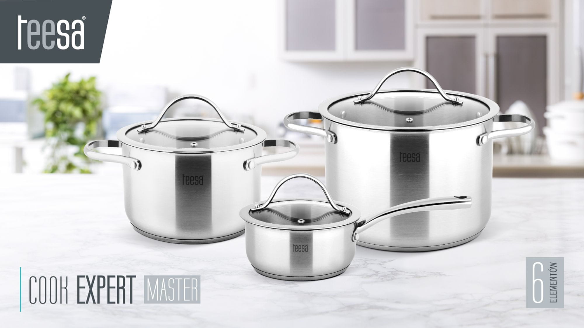 Močni lonci iz nerjavečega jekla so nujna oprema v vsaki kuhinji. Set loncev Teesa COOK EXPERT MASTER je bil ustvarjen s tem namenom. Set vsebuje 6-litrski in 3-litrski lonec iz nerjavečega jekla, 1-litrsko ponev in tri pokrove – popoln komplet, ki vam bo olajšal pripravo najrazličnejših jedi. Oblika loncev s profiliranimi robovi povečuje udobje uporabe z zmanjšanjem tveganja razlitja po štedilniku in pultu.