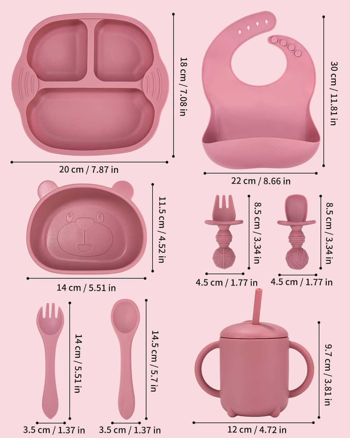 Silikonski komplet za hranjenje dojenčkov: 8 delni, krožnik in skleda s priseski, pribor - idealno za učenje samostojnega hranjenja