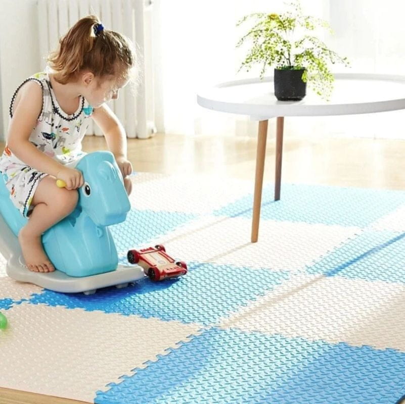 Podloga je izdelana v obliki sestavljanke, s 24 rumenimi in modrimi deli pa jo je preprosto in enostavno sestaviti.