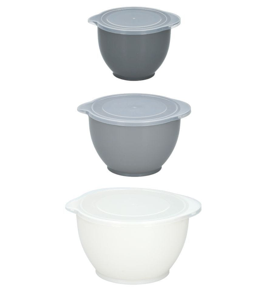 Iste ljubitelj peke? Potem je ta komplet posod za mešanje iz Alpine prava obvezna oprema za vašo kuhinjo. Komplet sestavljajo 3 posode za mešanje s pokrovi s prostornino 1,2, 2 in 3,4 litra. Z njim lahko pripravite vse vrste kulinaričnih dobrot. Od stepanja jajc do stepanja smetane, mešanja testa in mase,st.S pokrov, ročaj in izlivnik3 posode za mešanje so izdelane iz trpežne plastike in imajo pokrov. Tako lahko posode zaprete, če želite kaj shraniti. Imajo tudi ročaj, da lahko posodo držite med mešanjem, stepanjem ali mešanjem. Posode za mešanje imajo tudi izliv, zato lahko zlahka nalivate tekočine.Kompaktnin shranjujete3 posode za mešanje lahko glede na velikost potisnete drugo v drugo, zato je shranjevanje enostavno in kompaktno. Zaradi dizajna in barv bele in dveh različnih odtenkov sive so odličen dodatek za vsako sodobno kuhinjo.varne za mikrovalovno pečico in pomivalni strojMešalne posode so varne za mikrovalovno pečico (pokrovi niso!). Zato lahko set posod uporabite tudi za vnaprejšnje taljenje masla ali njegovo segrevanje. Opomba: posode za mešanje lahko postavite v mikrovalovno pečico. Pokrovi pa ne. Vedno postavite posodo v mikrovalovno pečico brez pokrovovka.Specifikacije:3 posode za mešanje 1,2/2/3/3,4 l3 pokroviSprejemljivo v pomivalnem strojuSprejemljivo v mikrovalovni pečici (samo posode)