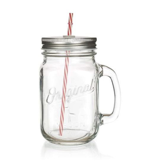 Stekleni kozarec 450 ml z izrezom, ročajem in pločevinastim pokrovom, oblika pokrova kozarca, luknja za slamico, višina kozarca 13,5 cm, barva pokrova srebrna. Celoten opis