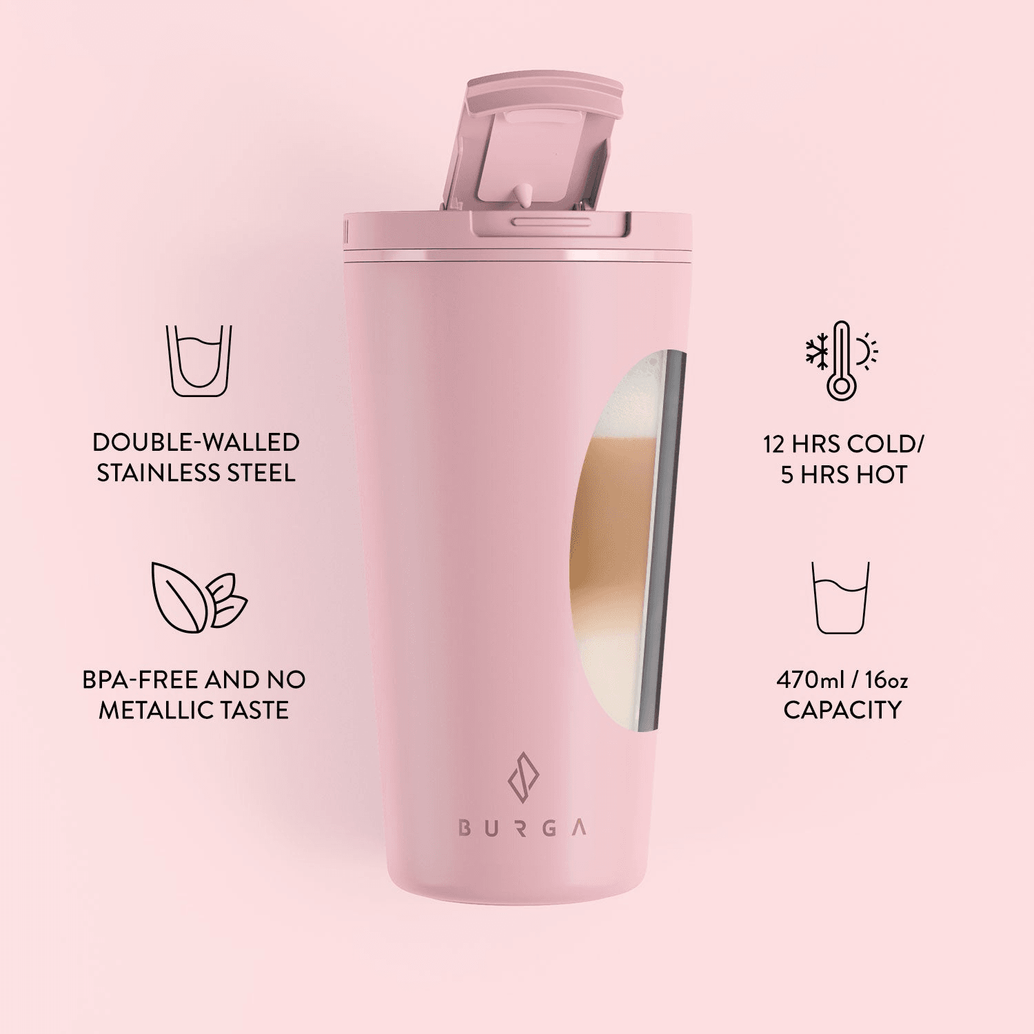 Odkrijte BURGA, blagovno znamko, ki združuje eleganco in funkcionalnost. Naša termo posoda ohranja pijače hladne do 12 ur in vroče do 5 ur, kar je idealno za vsakodnevno uporabo. Z BURGO boste uživali v stilu in prispevali k ohranitvi okolja. Celoten opis