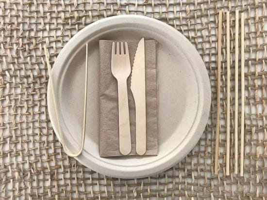 Set je izdelan povem iz naravnih materialov, tako da je povsem neškodljiv tudi, če slučajno ostane v naravi. Set vsebuje 4 krožnike izdelane iz sladkornega trsa. Noži in vilice so izdelani lesa, prtički, nabodala in obračalka pa so izdelani iz bambusa.