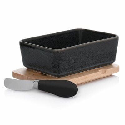 posoda za maslo duka warewood v grafitni barvi bo z zanimivo in brezčasno grafitno barvo obogatila vaš obrok in kuhinjski prostor. vzorec na posodi je iz reaktivne glazure*, zaradi česar je vsak kos edinstven. posoda za maslo je izdelana iz porcelana in ji je priložen nož za mazanje. Z namenskim nožem s pokrovom iz gumijastega lesa lahko maslo namažete na kruh na zabavah in zajtrkih. zaradi dobrega tesnjenja ostane maslo popolnoma sveže in na pravi temperaturi za mazanje. Priporočamo, da pokrov očistite ročno, posodo pa lahko pomivate v pomivalnem stroju.