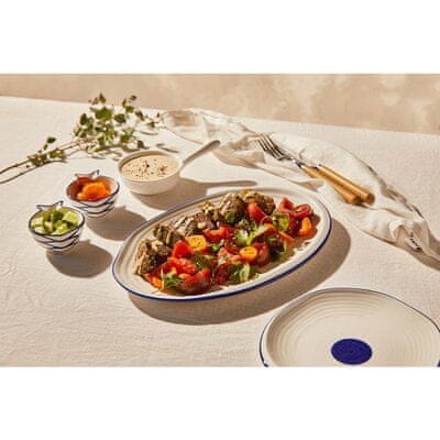 Krožnik Duka Krog je ponudba za vse ljubitelje nekonvencionalnega oblikovanja, ki iščejo praktičen namizni pribor za svojo kuhinjo. Zaradi velike velikosti je idealen za serviranje večerje, zaradi edinstvenega videza pa bo postal nesporen okras vaše mize. Neenakomeren, asimetričen rob krožnika Duka Krog je tisti, ki ga naredi izstopajočega in mu daje individualen značaj. Za poudarjanje njegovega nenavadnega videza je okrašen v mornarsko modri barvi, ki je velik kontrast beli površini stranic krožnika Duka Krog in zagotavlja, da bo zagotovo pritegnil pozornost vseh gostov, povabljenih k vaši mizi.