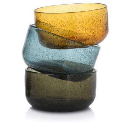 Zaradi svojih polprozornih lastnosti je idealna za serviranje ramenov ali jedi, v katerih lahko vidite sestavine. poudarila in omogočila bo uživanje na nov način. sklede so na voljo tudi v modri in sivi barvi. Mehurčki, ki so prisotni v vsaki skodelici ali krožniku, dajejo steklu edinstven značaj, ki se ga želite dotakniti in preveriti, ali iluzija zadrževanja vode ne razpade pod vašimi prsti. Barvni stekleni mehurčki, ki so na voljo v štirih različnih barvah – vijolični, modri, sivi in rumeni – bodo navdušili številne ljubitelje stekla.