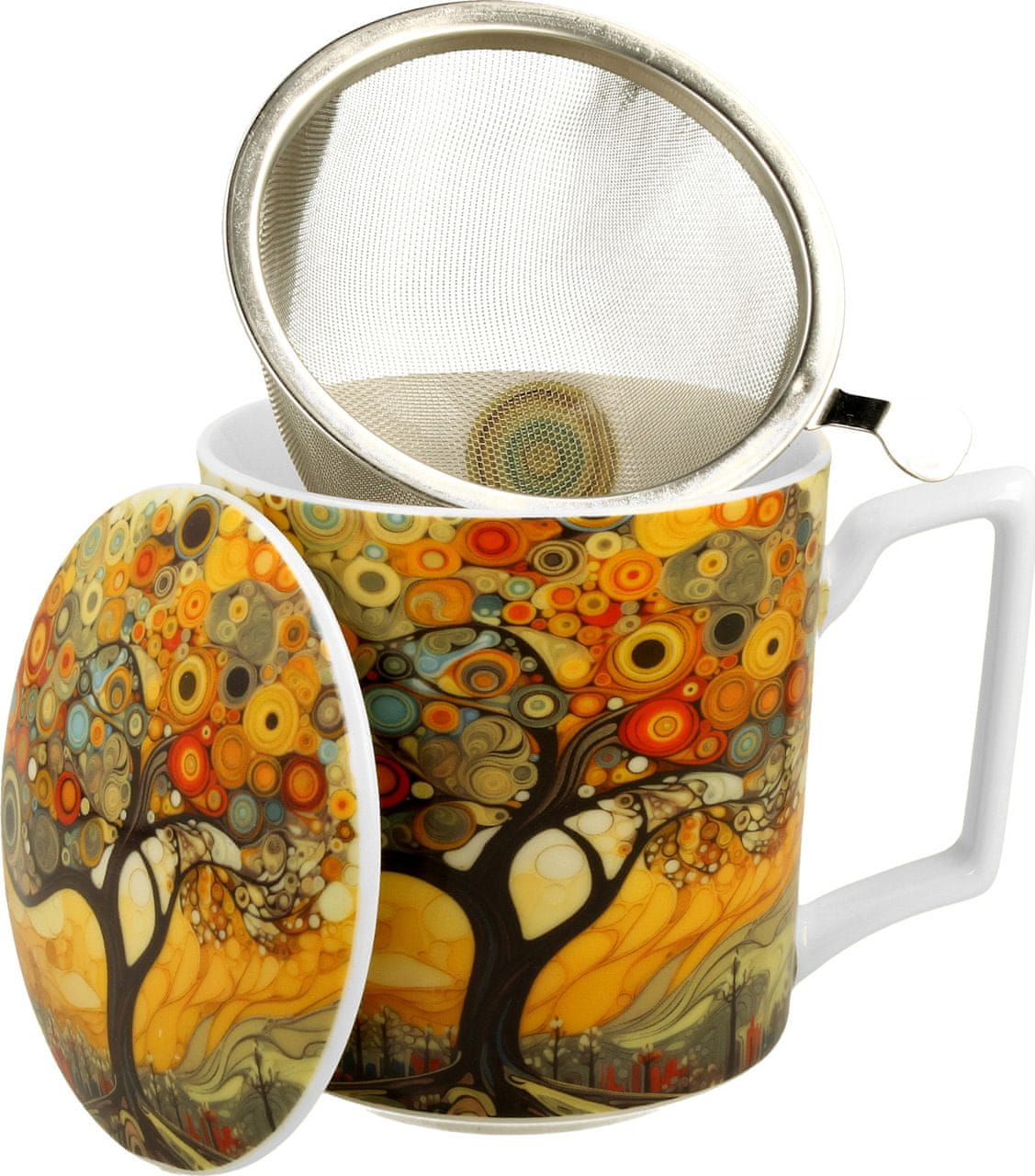 Eleganten komplet skodelice, pokrova in cedila za čaj. Moderni motiv Drevo. Porcelan, 450 ml. Lična embalaža, nadvse primerna za darilo. Celoten opis