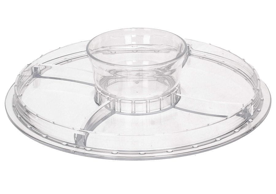 • večnamenska servirna posoda s pladnjem- skupno 6 različnih kombiniranih načinov uporabe- pladenj razdeljen na več delov za serviranje prigrizkov- kot posoda za čips ali tortilje s posodo za pomakanje v sredini- kot pladenj za torte ali sladice s pokrovom- ločen pladenj za torte in sladice- ločen pokrov npr. za desko za sir- prozorna kaljena PS plastika- praktičen pripomoček za serviranje hrane, široko področje uporabe- premer 30,5 cm- višina 20 cm