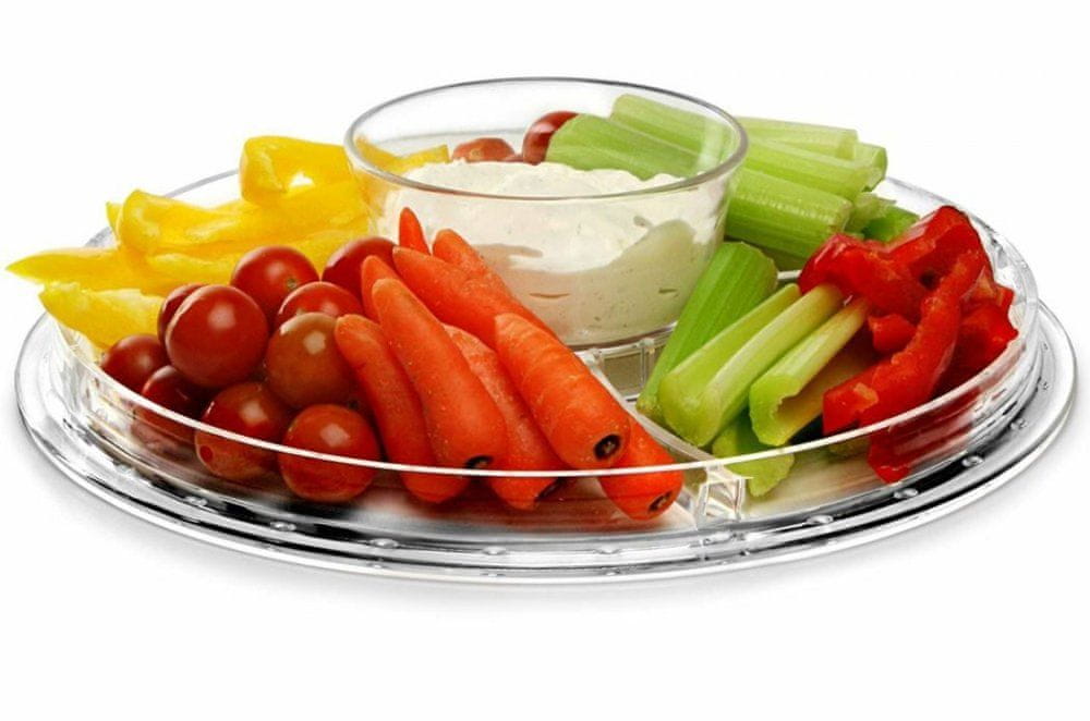 • Večnamenska posoda za serviranje s pladnjem – skupaj 6 različnih kombinacij uporabe – pladenj razdeljen na več delov za serviranje prigrizkov – kot posoda za čips ali tortilje s posodo za dip …
