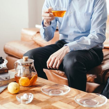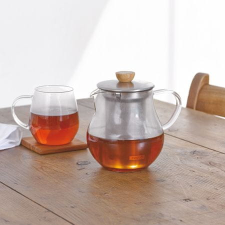 Filtrirni vrč je enostaven za uporabo in nikoli ne gre iz mode. Preprosto vlijte čaj v filter, zalijte z vročo vodo, počakajte nekaj minut in končano je. Filter lahko odstranite ali pa ga pustite v vrču. Fina mreža filtra zadrži posušen čaj v notranjosti, zato je infuzija čista. Steklena posoda je odporna na vročino in ima veliko odprtino, zato je priročna za čiščenje. Ročaj se ne segreva in omogoča enostavno prenašanje posode z vročo vsebino. Filter in pokrov sta izdelana iz nerjavečega jekla, ročaj pa iz naravnega lesa.