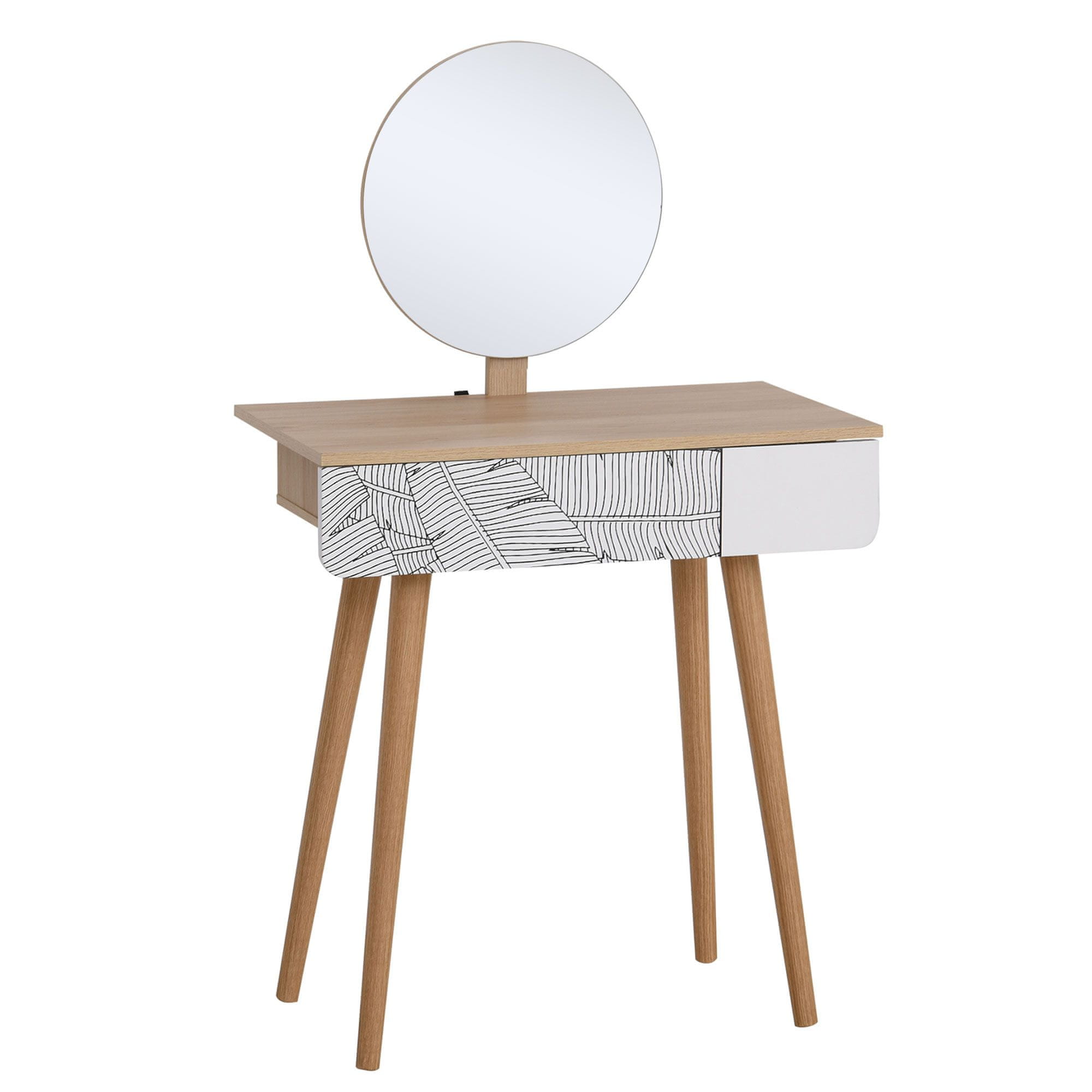 HOMCOM HOMCOM Miza za ličenje z okroglim ogledalom Ф39cm in predalom z dekoracijo džungle, bela in hrastova, 70x39x119-128cm