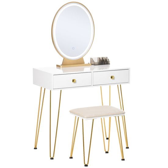 HOMCOM Industrijski stil LED osvetljeno straniščno ogledalo, mizica za ličenje s stolčkom, straniščna omarica s stikalom na dotik, bela