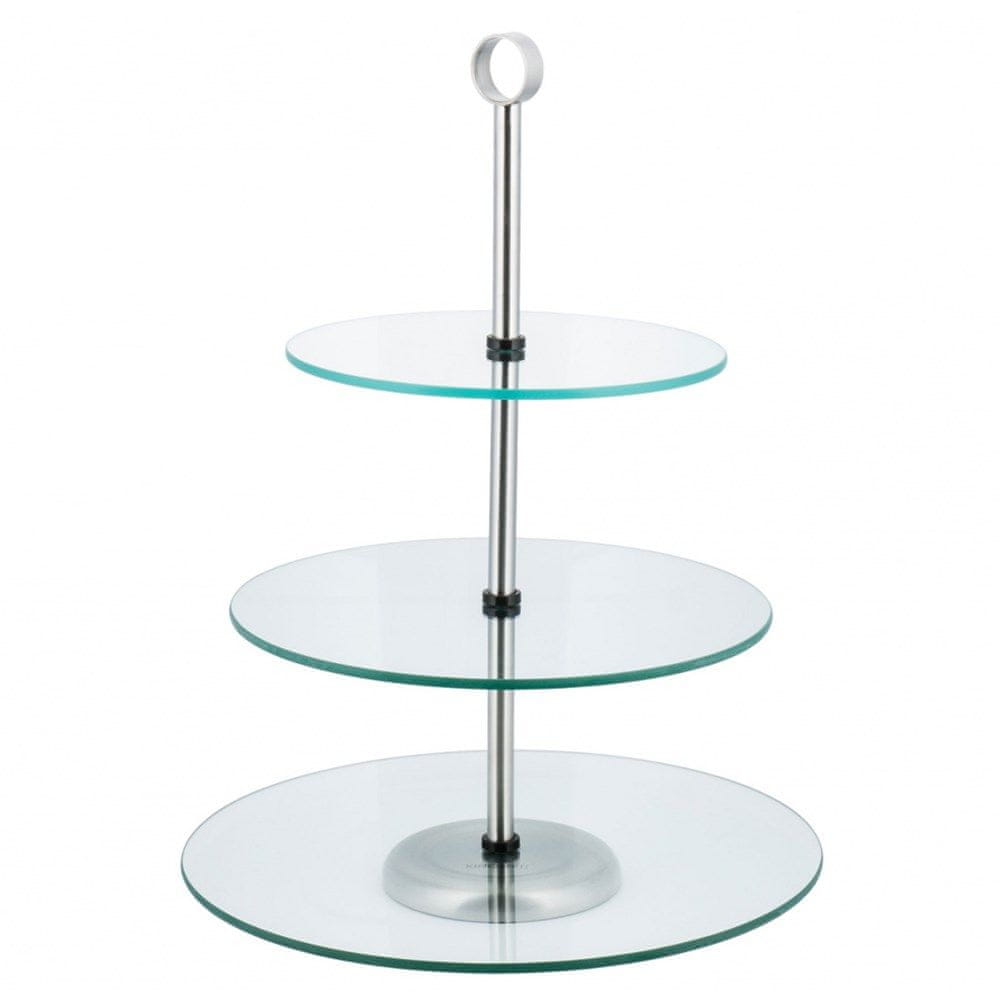 Elegantno, tristopenjsko stojalo za torte, sendviče, sadje ali prigrizke. Izdelano iz kaljenega stekla in satenastega nerjavečega jekla.