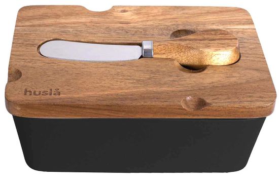 Črna posoda iz keramičnega masla s pokrovom iz akacijevega lesa. Priložen je z oblikovanim nožem za mast z lesenim ročajem. Lesen pokrov podaljša svežino masla.