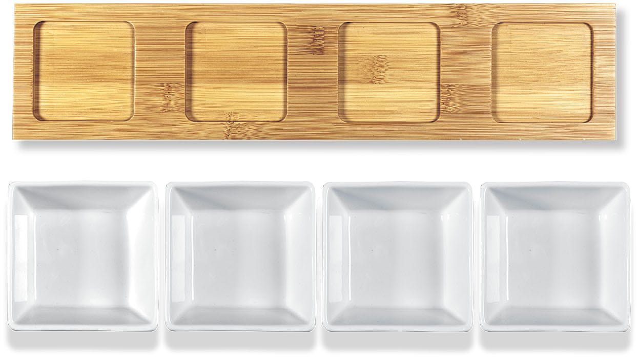 Set vsebuje 4 servirne posode iz belega porcelana in lesen pladenj. Velikost ene posode je 38 × 9 cm. Celoten opis