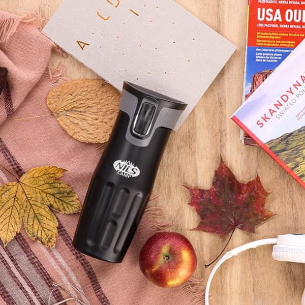 Termalni vrč Nils Camp NCC06 odlikujeta preprosta konstrukcija in izviren dizajn! NCC06 je termalni vrč iz nerjavečega jekla z dvojno steno, ki zagotavlja, da bo vroče pijače ohranjal vroče 12 ur, hladne pa 24 ur. Termo vrč NCC06 ima inovativen sistem odpiranja. Če želite piti, pritisnite in pridržite gumb – zapora za odpiranje se sprosti. Če pa želite zakleniti odprtino, preprosto sprostite gumb. Skodelica ima tudi relief na območju za držanje, zaradi česar jo je lažje držati in varneje prenašati. Še ena odlična lastnost je, da je spodnji del vrča opremljen z nedrsečo gumo, ki povečuje varnost pred razlitjem vroče kave ali čaja, ko je vrč odprt!