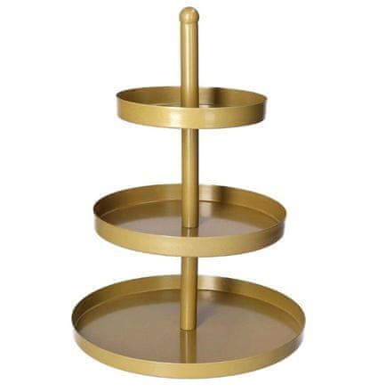 Načrtujete praznovanje ali poroko ali se bliža december? Olajšajte si postrežbo piškotov, tort, kolačkov ali mafinov s trostopenjsko polico iz nerjavečega jekla zlate barve, ki ni samo praktičen, temveč tudi okrasni dodatek. To 35 cm visoko servirno stojalo je idealno za predstavitev tort, sladic, makronov, tapasov, sadja ali slanih dobrot. Zahvaljujoč klasični trinadstropni zasnovi prihrani prostor na mizi in hkrati omogoča lepo razporeditev jedi.