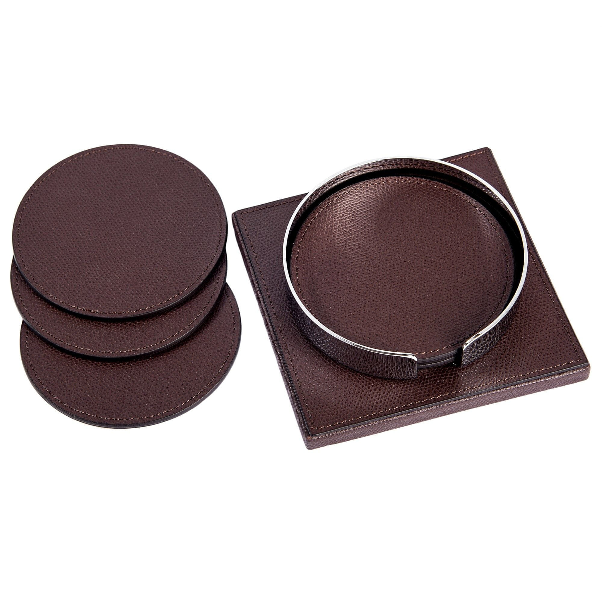 Komplet šestih podstavkov s kromiranim stojalom je izdelan iz temno rjave Liverpoolove telečje kože, ki je zelo odporna na vodo in praske. Celoten opis