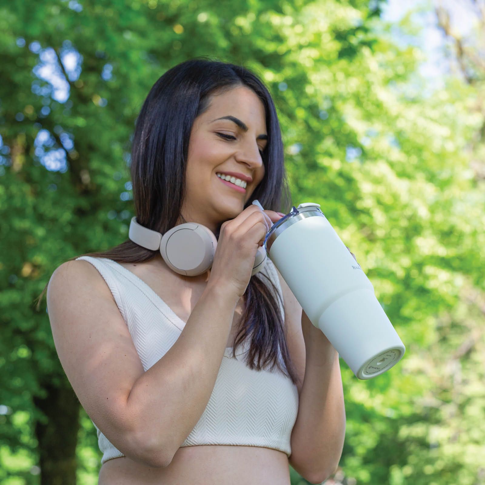Njegova velika prostornina in priročen ročaj poskrbita za enostavno prenašanje in udobno uporabo, vitka oblika pa omogoča shranjevanje v večini avtomobilskih držal za pijačo. S trajnostno zasnovo zmanjšuje uporabo plastenk za enkratno uporabo ter predstavlja okolju prijazno izbiro za vse, ki cenijo funkcionalnost in stil.
