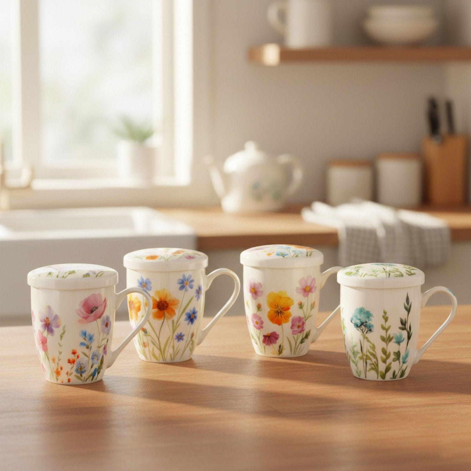 Naša ponudba vključuje tudi druge skodelice s cedilom v podobnem cvetličnem dizajnu, kot tudi aromatične čaje v lističih, ki odlično dopolnjujejo komplet.