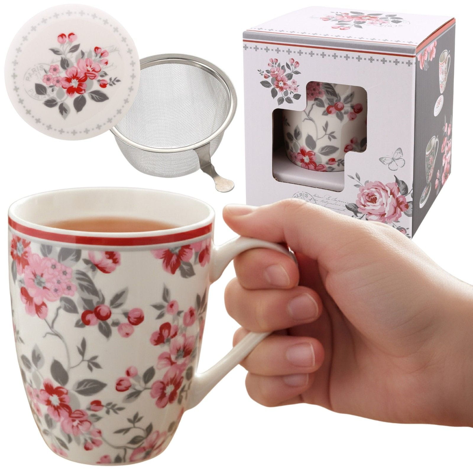 sarcia.eu SET ZA ČAJ: 340 ml porcelanast VRČ s čajni filter IN POKROVČKOM za zelišča – ZAPAKIRANO V DARILNI ŠKATLI