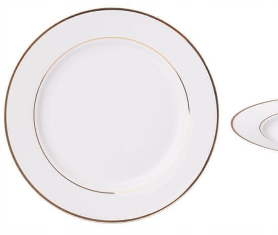 Okrogel desertni krožnik Ambition 16 cm. Ta desertni krožnik Ambition iz serije Aura Gold je eleganten in eleganten dodatek za serviranje sladic in tort. Njegov premer je 16 cm, kar omogoča estetsko prijetno in priročno serviranje izbrane jedi. Zaradi svoje zasnove ne priporočamo uporabe v pomivalnem stroju ali mikrovalovni pečici. Prednosti izdelka: Elegantna oblika: okrašena z nežnim zlatim vzorcem, ki doda eleganten in eleganten videz. Vzdržljivost: izdelana iz visokokakovostnega porcelana, kar zagotavlja vzdržljivost in odpornost proti praskam in poškodbam. Enostavno čiščenje: porcelanasta površina krožnika je gladka in enostavna za čiščenje, zato jo je enostavno vzdrževati čisto in pripravljeno za uporabo. Tehnični parametri: Premer: 16 cm Dolžina: 16 cm Širina: 16 cm Barva: bela, zlata Oblika: okrogla Vzorec: gladek Material: porcelan Kolekcija: Aura Gold