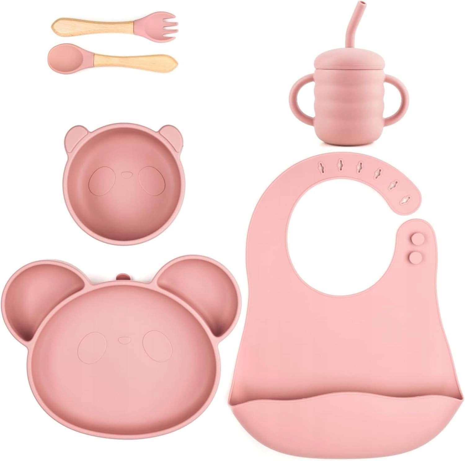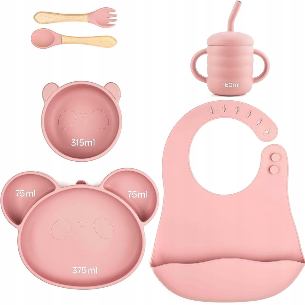 Celoten komplet pribora Panda Baby je odlična rešitev za malčke, ki se učijo samostojno jesti. Komplet je izdelan iz varnega silikona in vključuje krožnik, skledo, skodelico s slamico, slinček, žlico in vilice . Zahvaljujoč nedrsečemu prisesku se krožnik in skleda stabilno oprimeta površine in preprečujeta nenamerno prevračanje. Specifikacije: