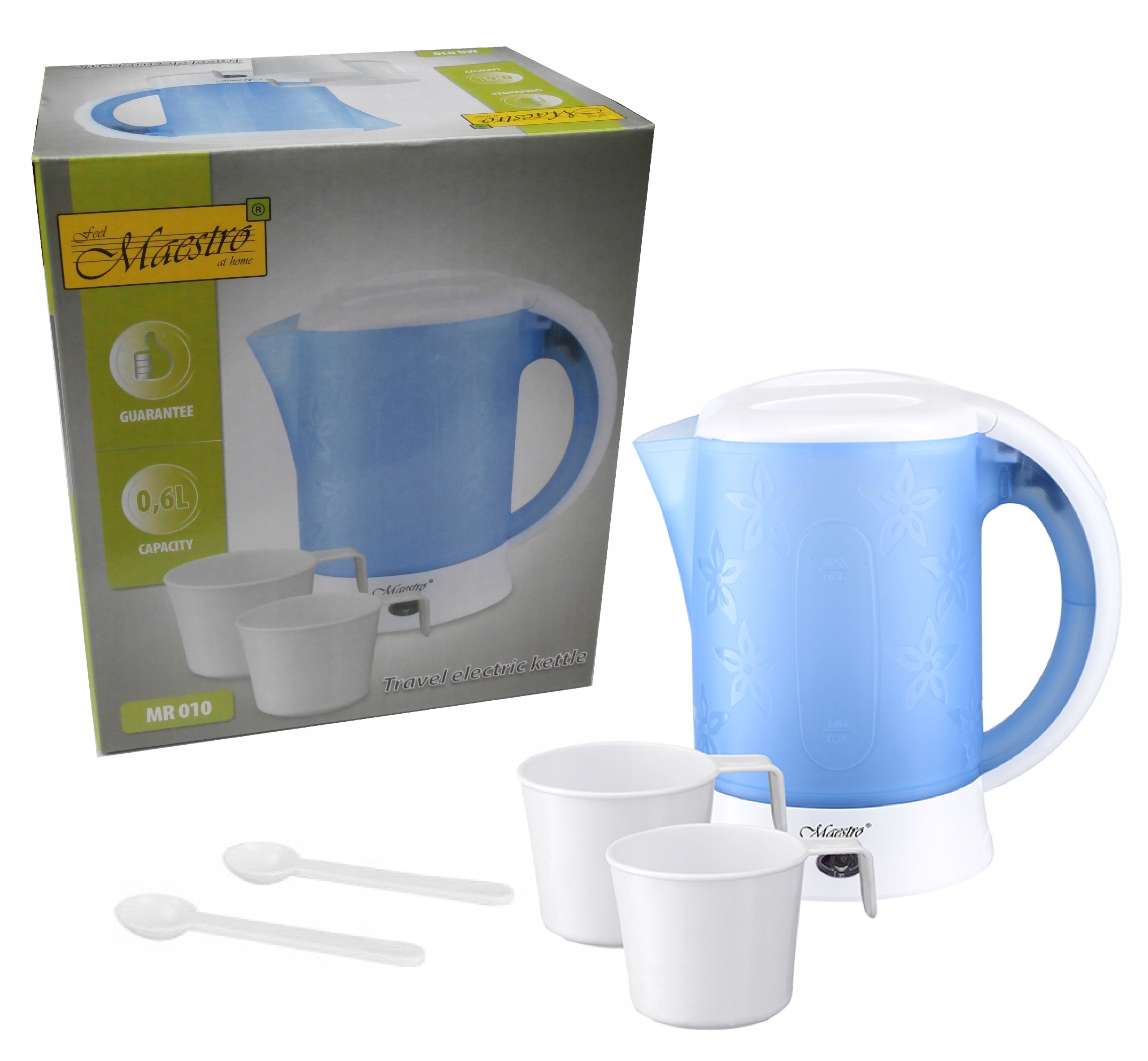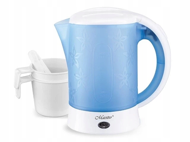 Električni grelnik vode MAESTRO MR-010 je turistična različica, ki omogoča zavretje 0,6 l vode. Zaradi varnosti ima naprava funkcijo zaščite pred pregrevanjem, ki se samodejno izklopi, če doseže nevarno visoko temperaturo. Komplet vsebuje dve skodelici z udobnimi ročaji.