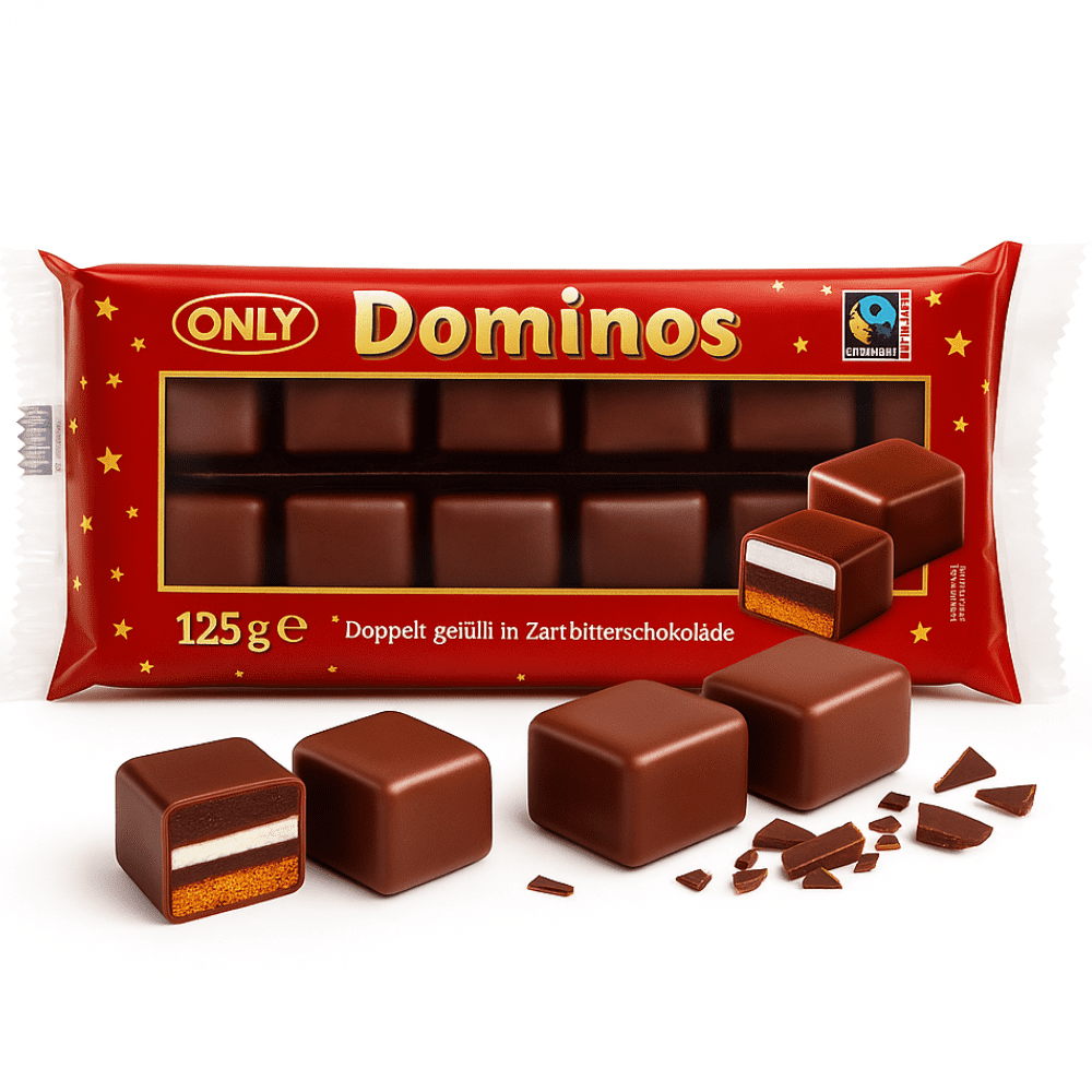 Domino kocke s temno čokolado so izvrstna mešanica tradicije in sodobnega okusa. Te majhne čokoladne kocke združujejo bogat, intenziven okus temne čokolade s subtilnimi plastmi marcipana in sadnega želeja. Vsaka kocka je popolnoma uravnotežena mešanica, ki bo zadovoljila tudi najbolj zahtevne sladokusce.