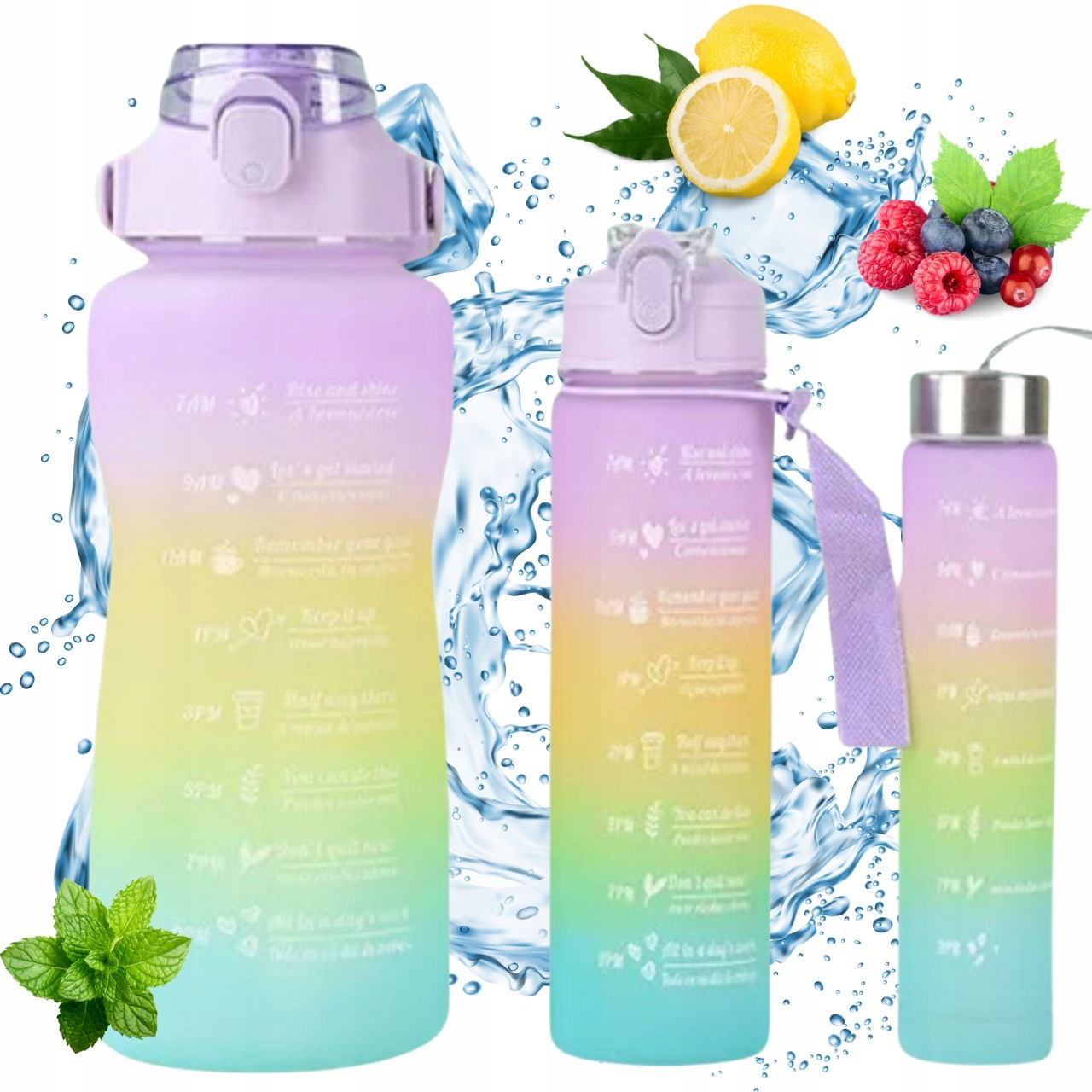 Vijolične, rumene in modre steklenice za vodo 2000 ml, 900 ml in 300 ml