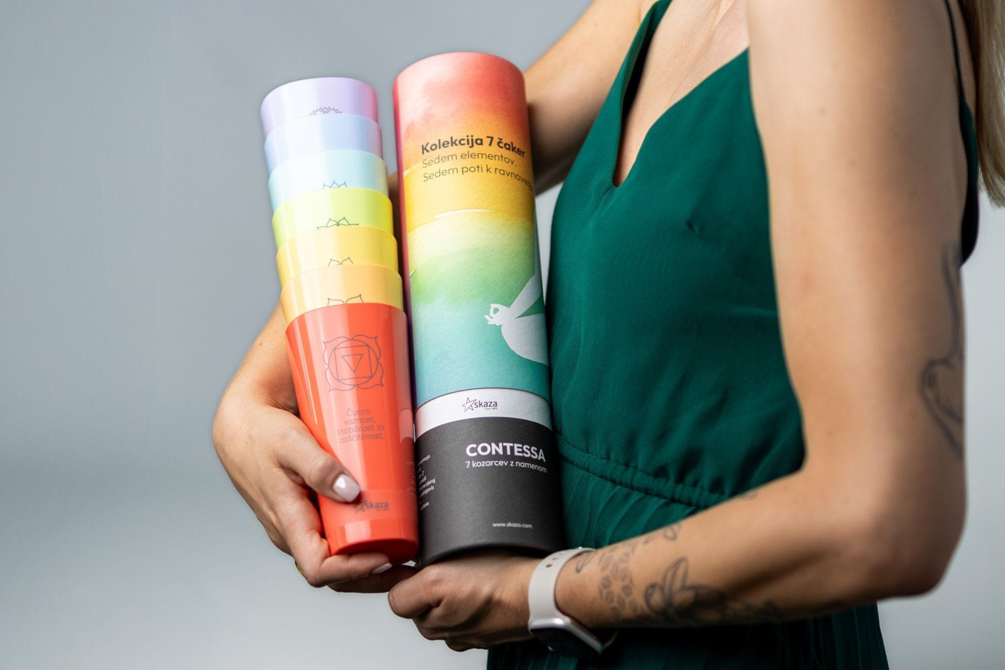 Kolekcija kozarcev 7 ČAKER združuje estetsko dovršen dizajn in globlji pomen, saj vsak kozarec predstavlja eno izmed sedmih čaker ter vključuje navdihujočo afirmacijo v angleškem jeziku. Barvna simbolika pomaga ustvarjati ravnovesje med telesom, umom in duhom ter vsak požirek spremeni v kratek osebni ritual zavedanja.