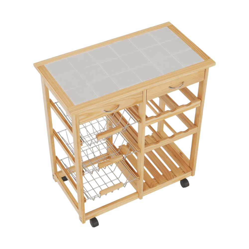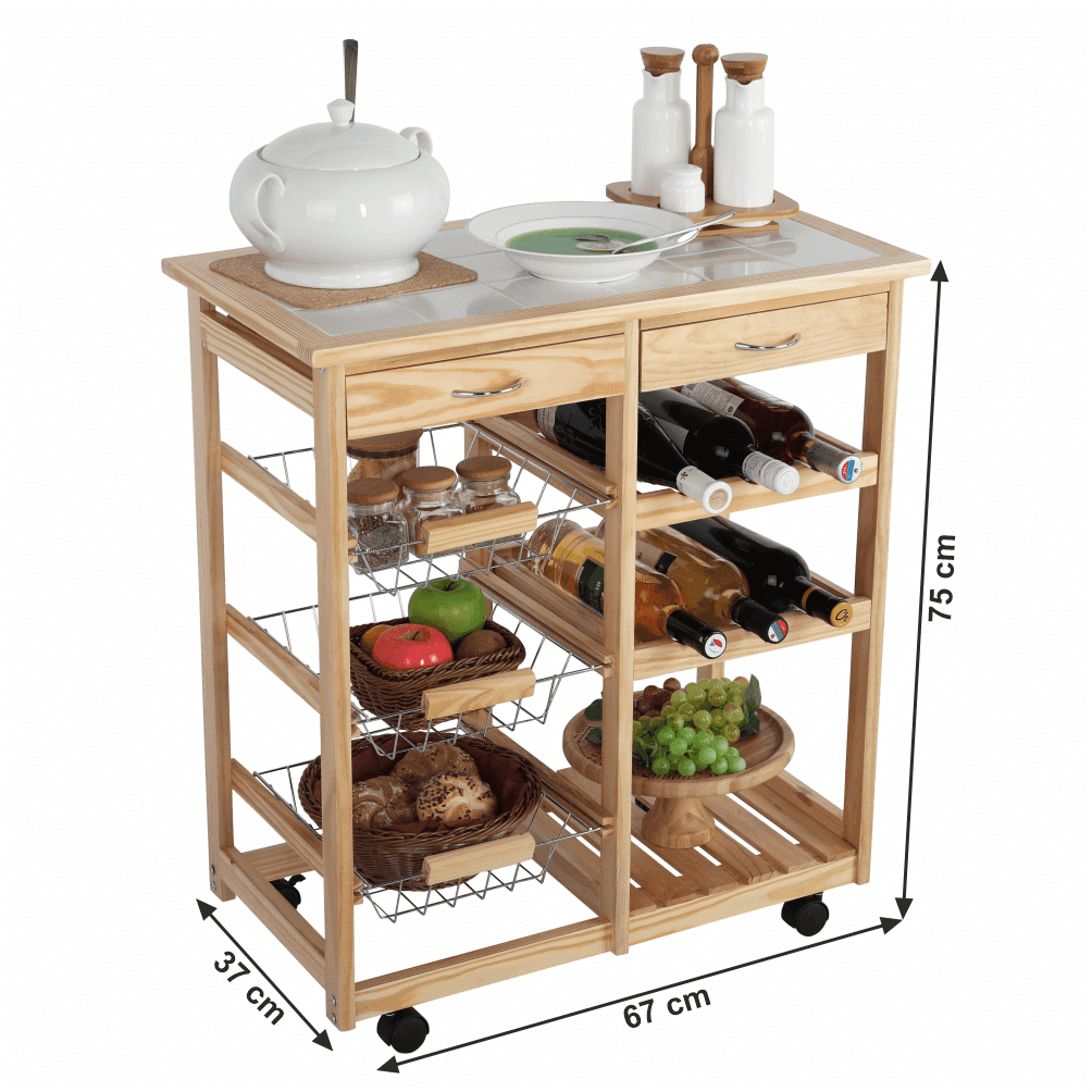 Material: keramika / masivni les Barva: naravna Dimenzije (ŠxVxV): 67×37×75 cm 3 kovinske košare Izberete lahko košare 2 predala odprta polica 2 polici za steklenice na kolesih Dobavljeno razstavljeno Celoten opis