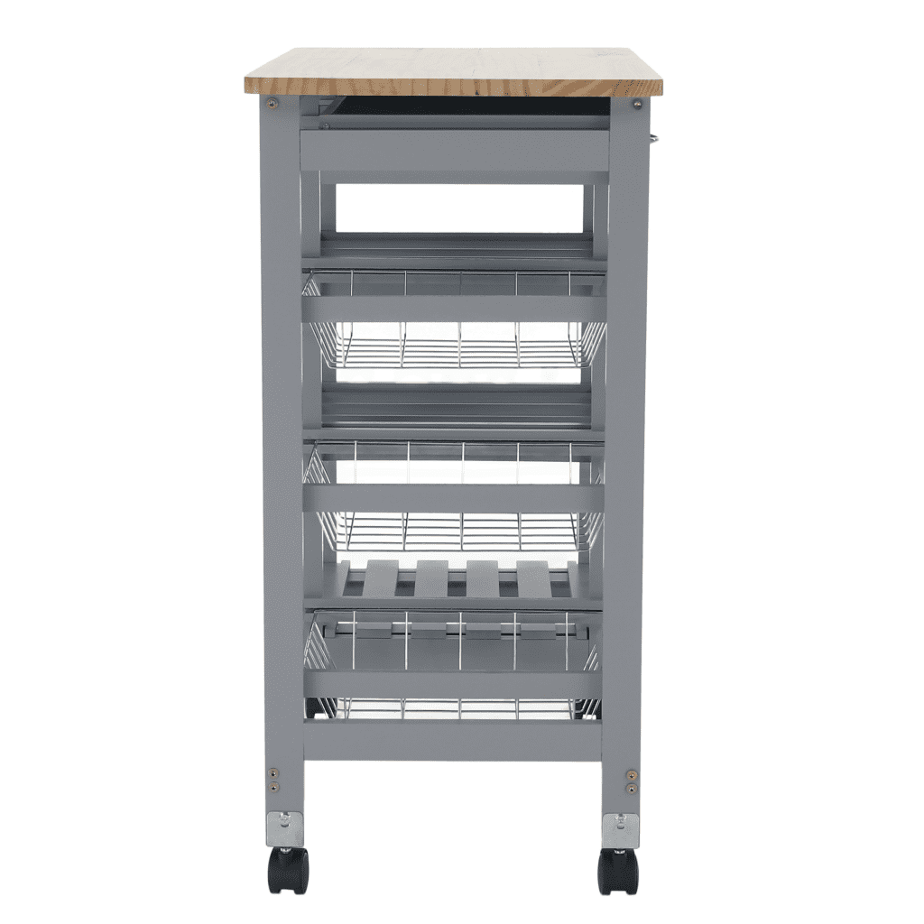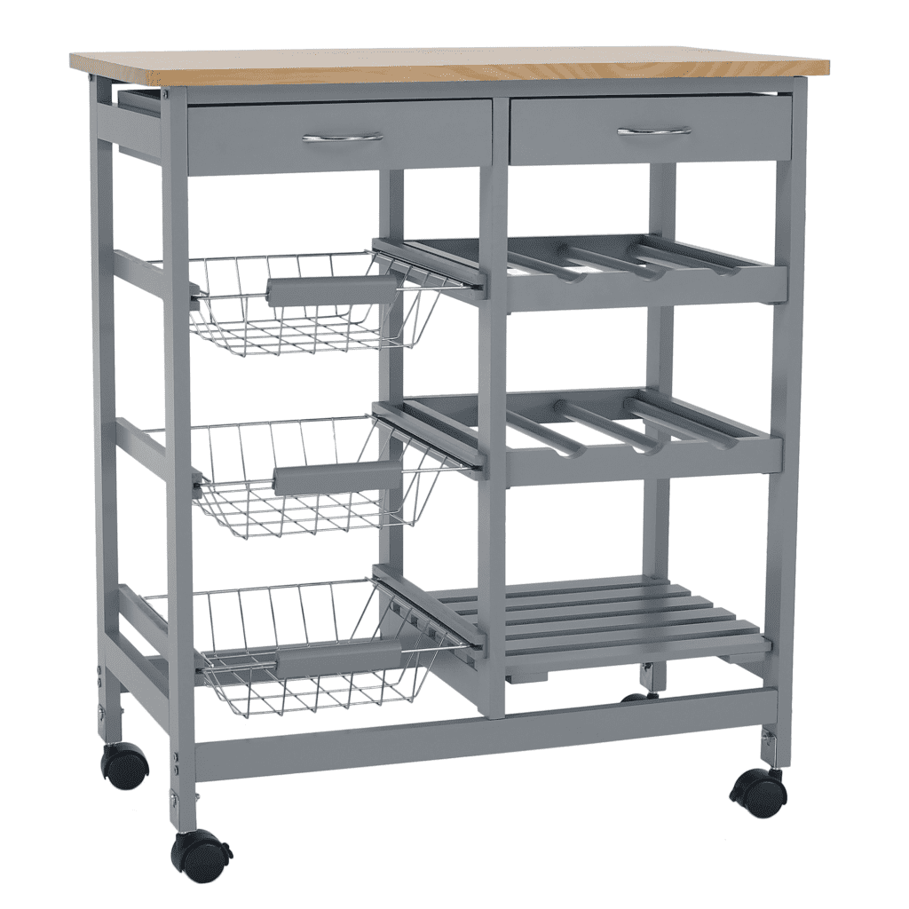 Material: mdf/kovina/plastiko Barva: siva/naravni bor Dimenzije (ŠxVxV): 67×37×76 cm Zmogljivost obremenitve: 10 kg/polica 2 kolesi z zavorami 2 predala 2 polici za steklenice Spodnja polica 3 izvlečne košare Večnamenski pomočnik Dobavljeno v razstavljenem stanju Celoten opis