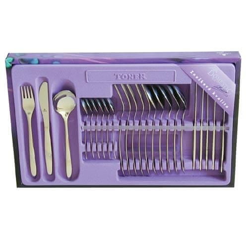 Pribor ROMANCE 24 kosov DBP Komplet jedilnega pribora iz nerjavečega jekla ROMANCE je primeren za domačo in gostinsko uporabo. Vsebina kompleta je 6 kosov žlic, 6 kosov vilic, 6 kosov nožev in 6 kosov kavnih žličk. Dobavljen je v darilni škatli. Celoten opis