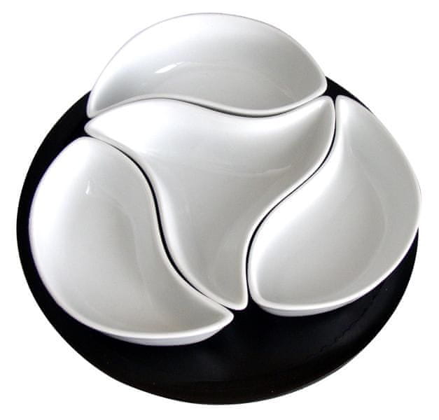 Zelo priljubljen komplet štirih skodelic „pinwheel“ na lesenem vrtljivem pladnju. Zelo praktično pri serviranju različnih jedi. Sklede imajo lep sodoben dizajn in zelo zanimivo obliko, pladenj je enostaven za pranje, samo obrišite ga z vlažno krpo. Sklede je mogoče pomivati v pomivalnem stroju. Prostornina skodelic je 125 ml. Dimenzije – 12,6 × 4,3 × 12,6 cm.
