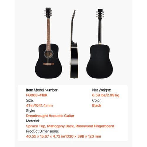 VEVOR Akustična kitara Dreadnought začetni komplet 10414 mm črna