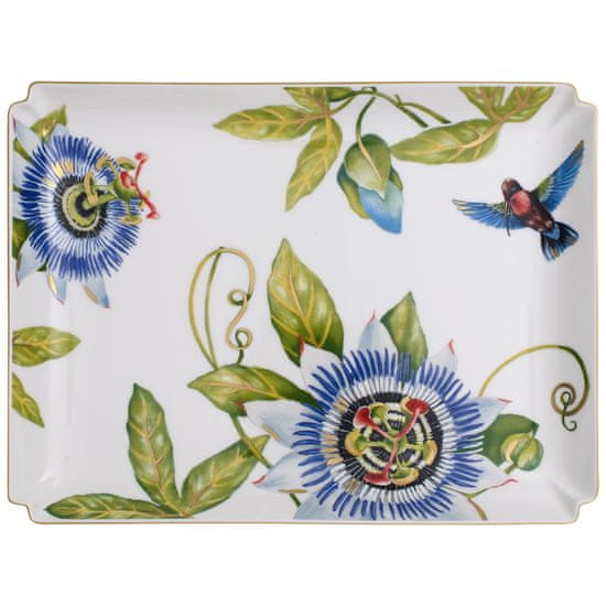 Velik okrasni pladenj iz porcelana iz kolekcije Amazonia z eksotičnim motivom 28 × 21 cm. Ročno pozlačen z 20 karatnim zlatom. Celoten opis