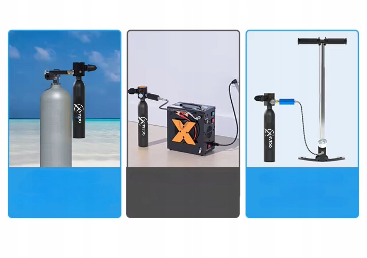 V kompletu je tudi črpalka OceanX za polnjenje vaše jeklenke s kisikom. Črpalka jeenostaven za uporaboin omogoča hitro in učinkovito polnjenje rezervoarja, kar zagotavlja, da ste vedno pripravljeni na naslednjo podvodno avanturo. S to rešitvijolahko uživate v nemotenem potapljanjubrez dolgih prekinitev polnjenja.