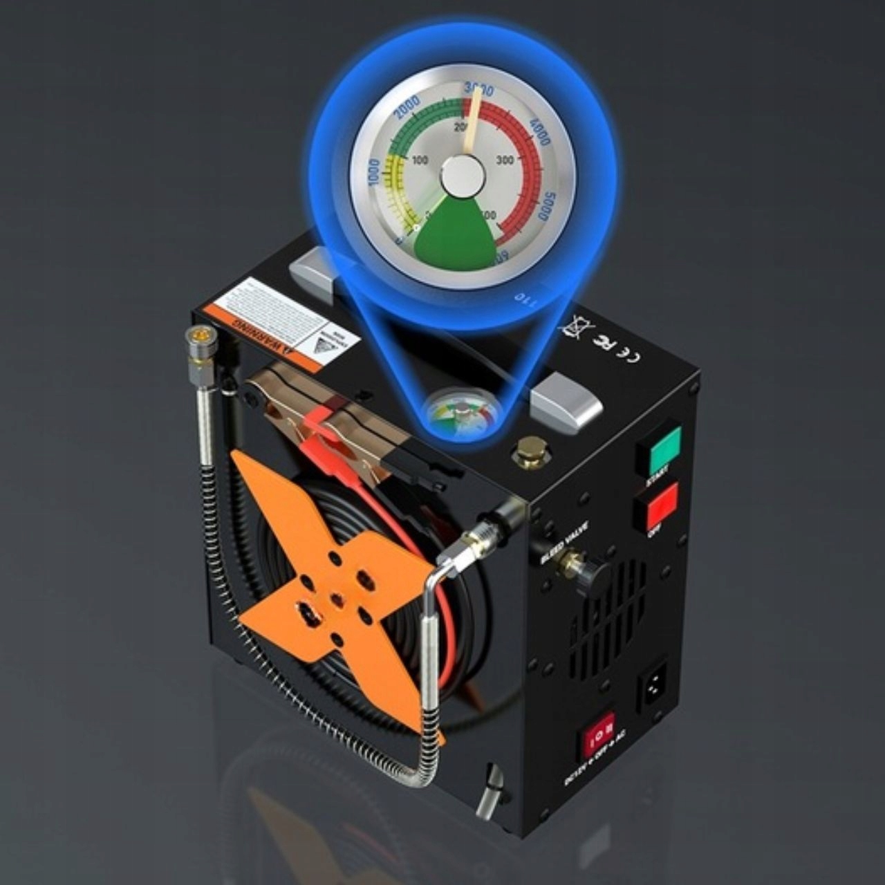 Največji delovni tlak tega zračnega kompresorja je 4500 psi/30 MPa/310 barov. Manometer ima dva manometra, enega za tlak v realnem času in drugega za nastavljeni tlak. Preprosto nastavite napihovalni tlak in ko bo nastavljeni zračni tlak dosežen, bo stroj samodejno prenehal napihovati.