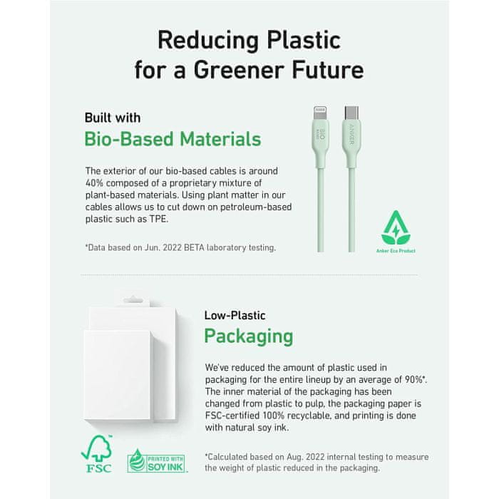 • Zasnova na biološki osnovi: Zunanjost ohišja kabla je izdelana iz materialov na biološki osnovi iz rastlin, kot sta koruza in sladkorni trs.