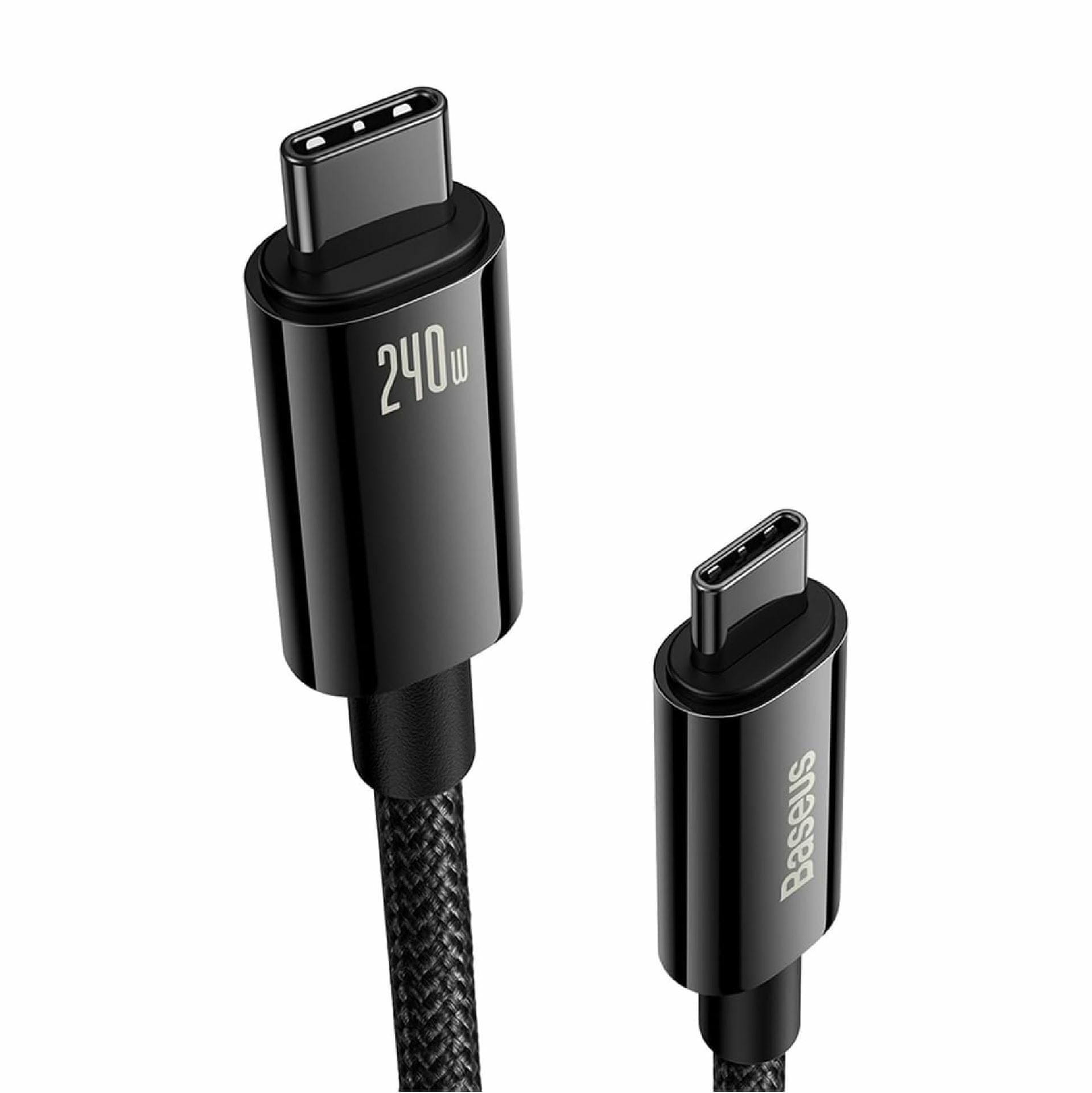 Baseus USB C-C kabel, črne barve, primeren za polnjenje vseh naprav z USB tip-C vmesnikom. Podpora standardu Power Delivery (PD) do 240 W omogoča hitro polnjenje prenosnikov, tablic, switchov in mobilnih naprav. Kabel podpira napetosti do 48 V pri 5 A, ima vgrajen e-označevalnik (e-marker) za varno uporabo pri visokih močeh, in je izdelan iz trpežnih materialov, ki zagotavljajo dolgo življenjsko dobo in odpornost na upogibanje.