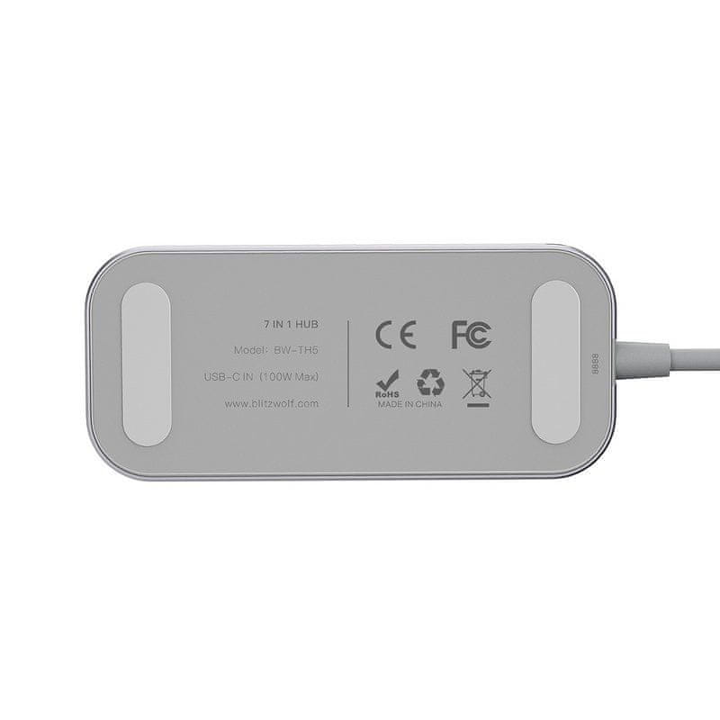 Producent BlitzWolf Model BW-TH5 USB-C vtič Vrata 1× HDMI, 3× USB 3.0, 1× USB-C PD, 1× SD, 1× Micro SD Ločljivost slike HDMI: 4K pri 30 Hz, FullHD pri 60 Hz 100 W PD moč USB 3.0 hitrost prenosa do 5Gbps Hitrost prenosa SD/micro SD kartice do 480 Mb/s Siva barva Dimenzije 95 × 45 × 11 mm Teža 52g Material Aluminij