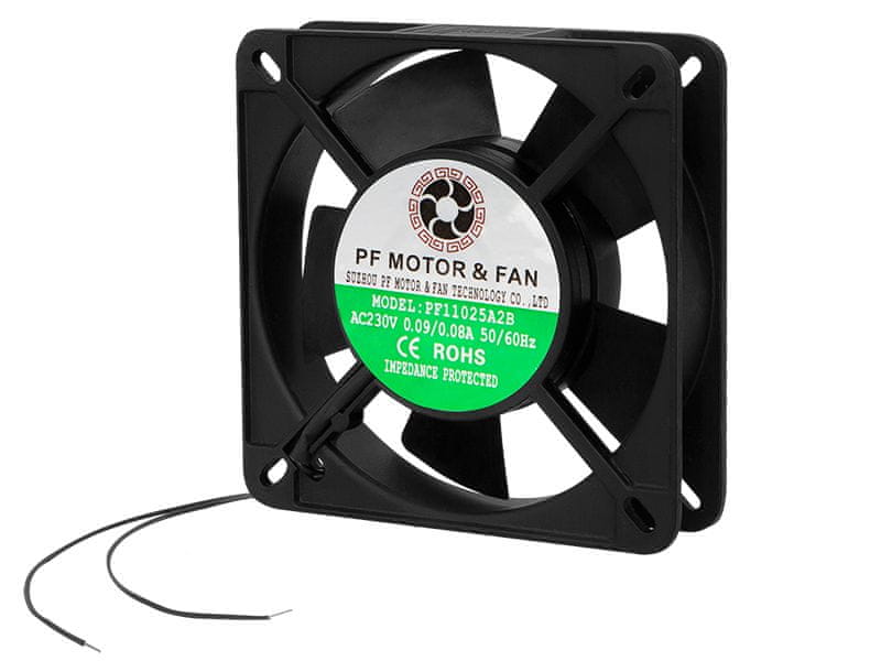 Tehnične specifikacije: -Merjave: 110 × 110 × 25mm – Napajanje: 230VAC – Pretok zraka: 81,6/h – Tok: 0,08A – Hitrost: 2150rpm – Stopnja hrupa (na 1m): 33dB – Weight: 330g – Operating temperature: –20 C ~ +80 C Celoten opis
